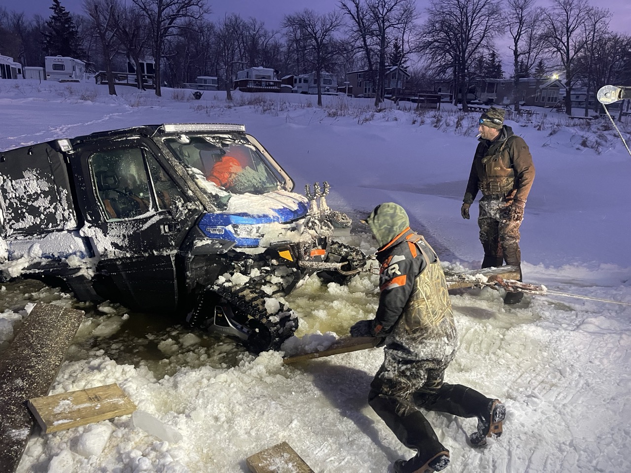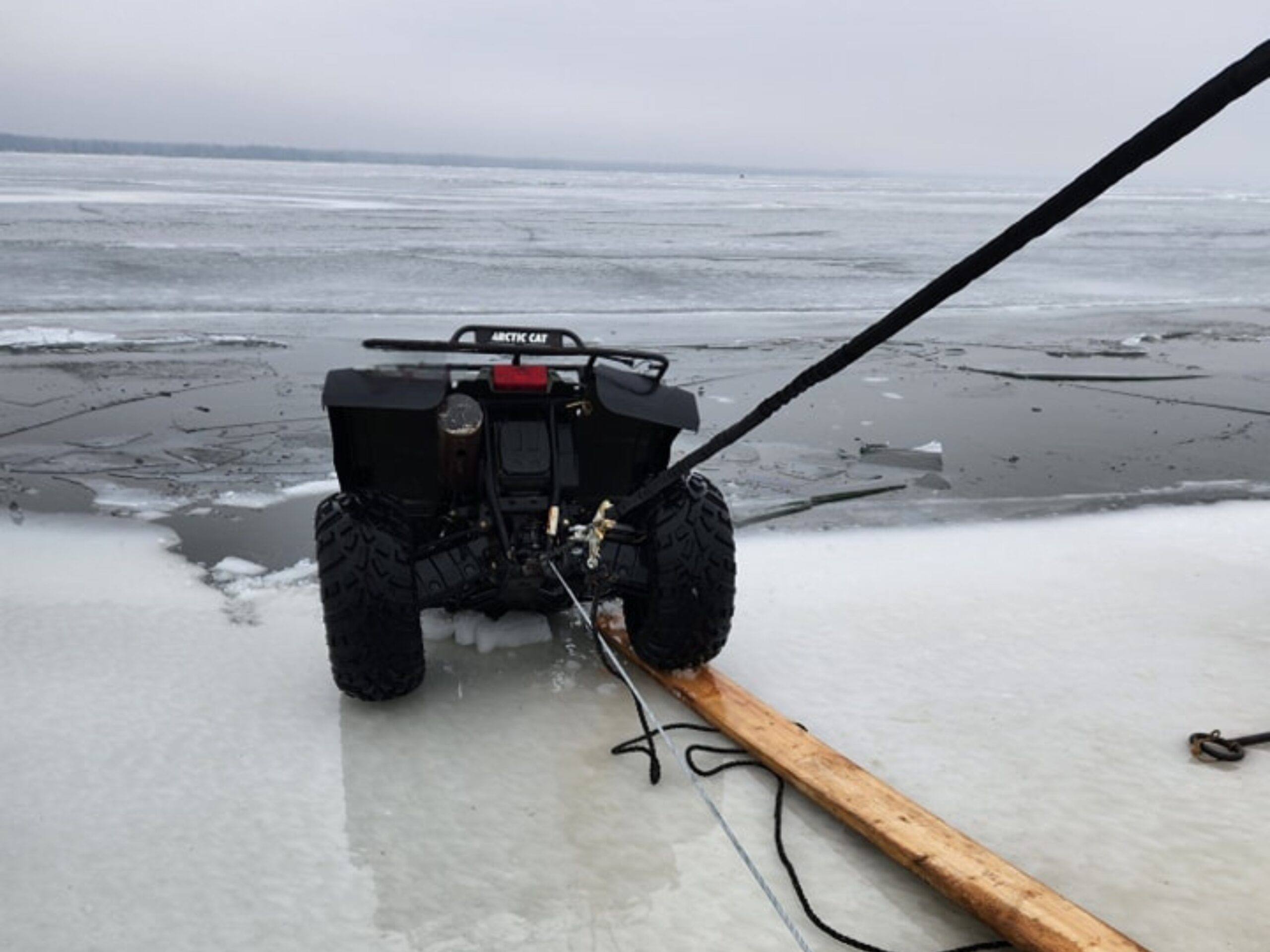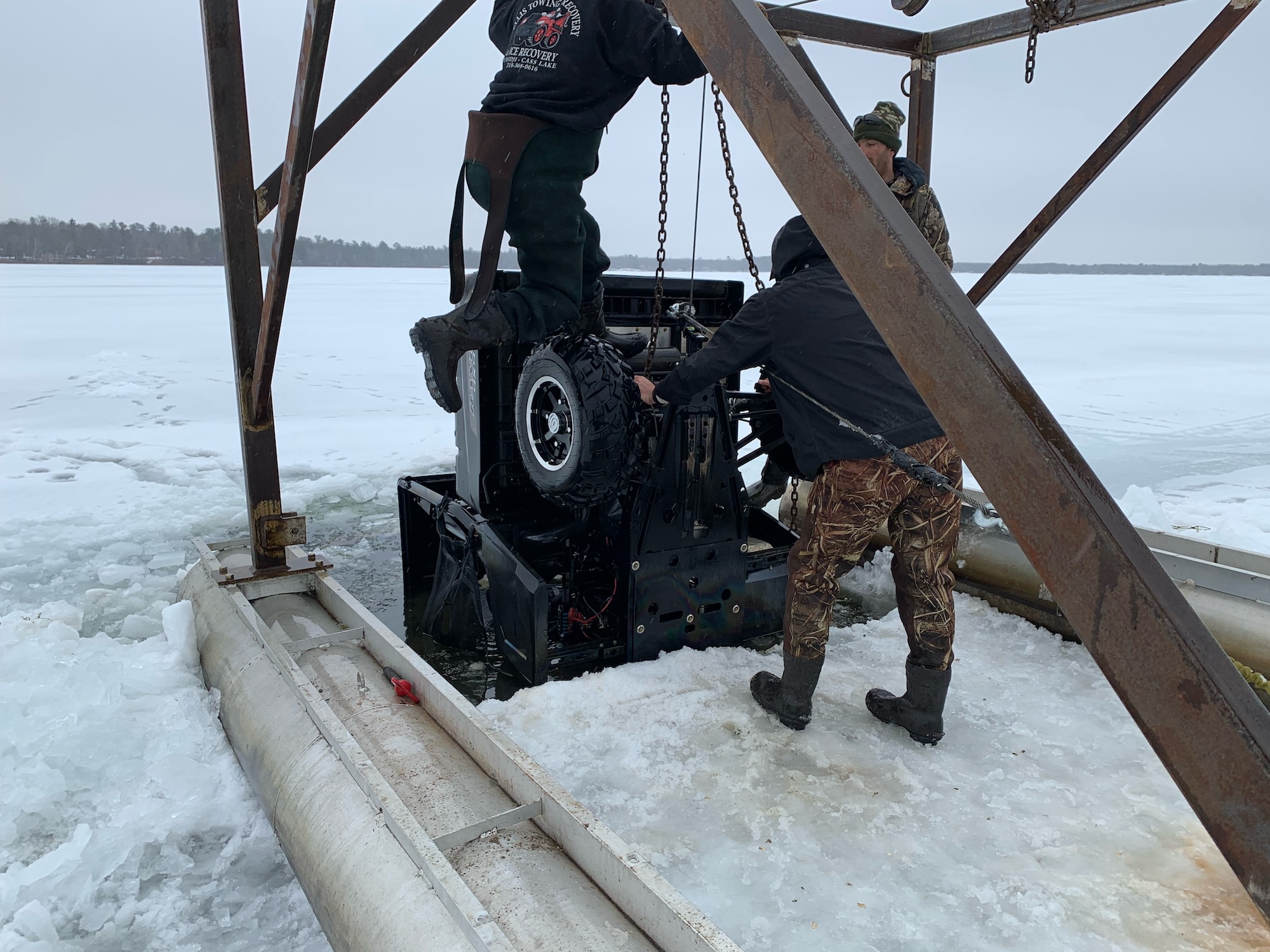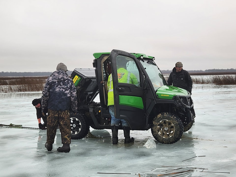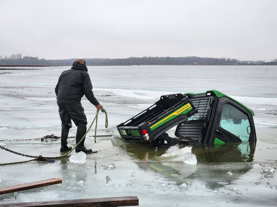John Deere gator side by side was towing a wheeled fish house off the lake ahead of some rain and broke through. We detached and recovered both in deteriorating conditions.