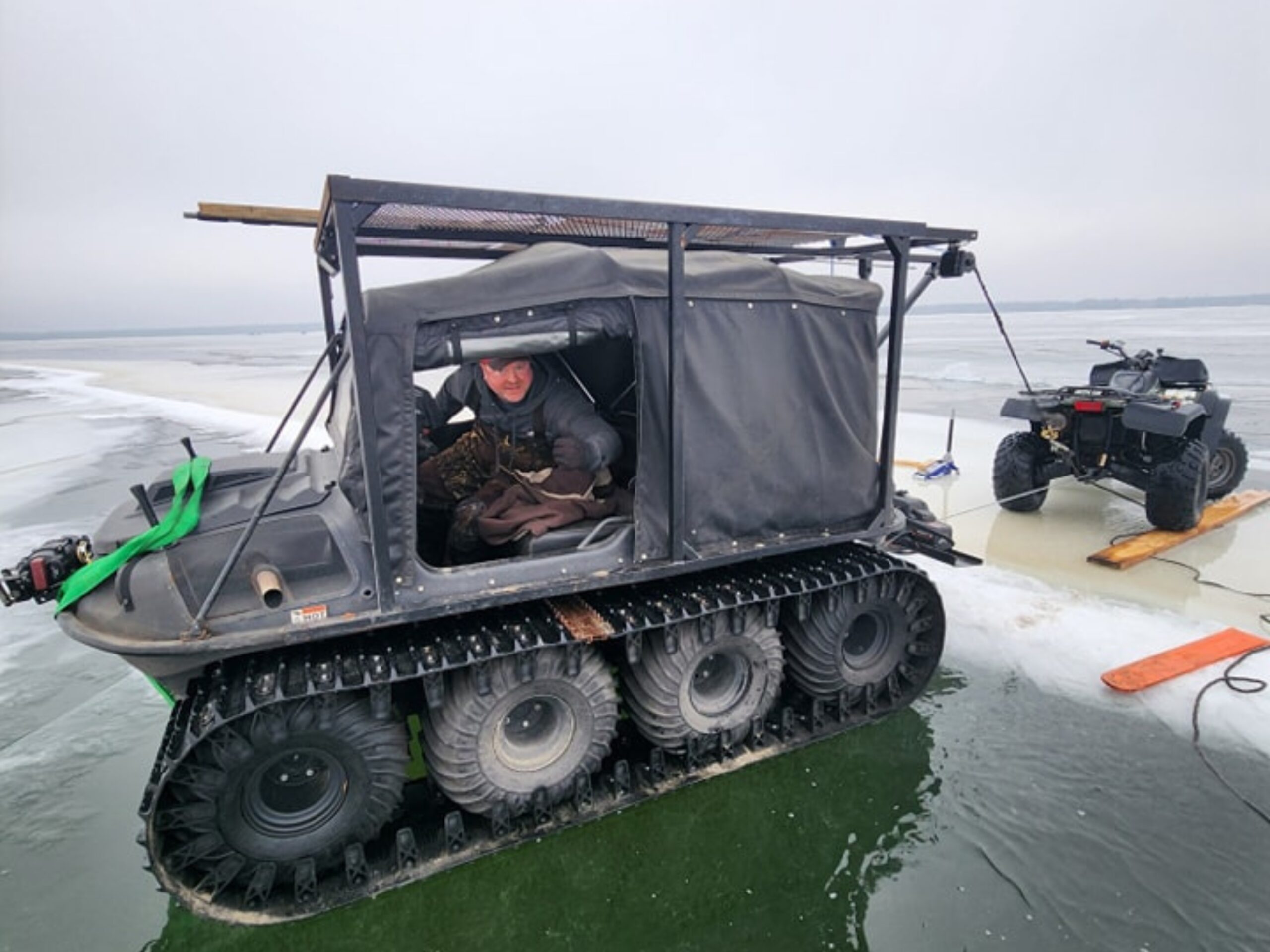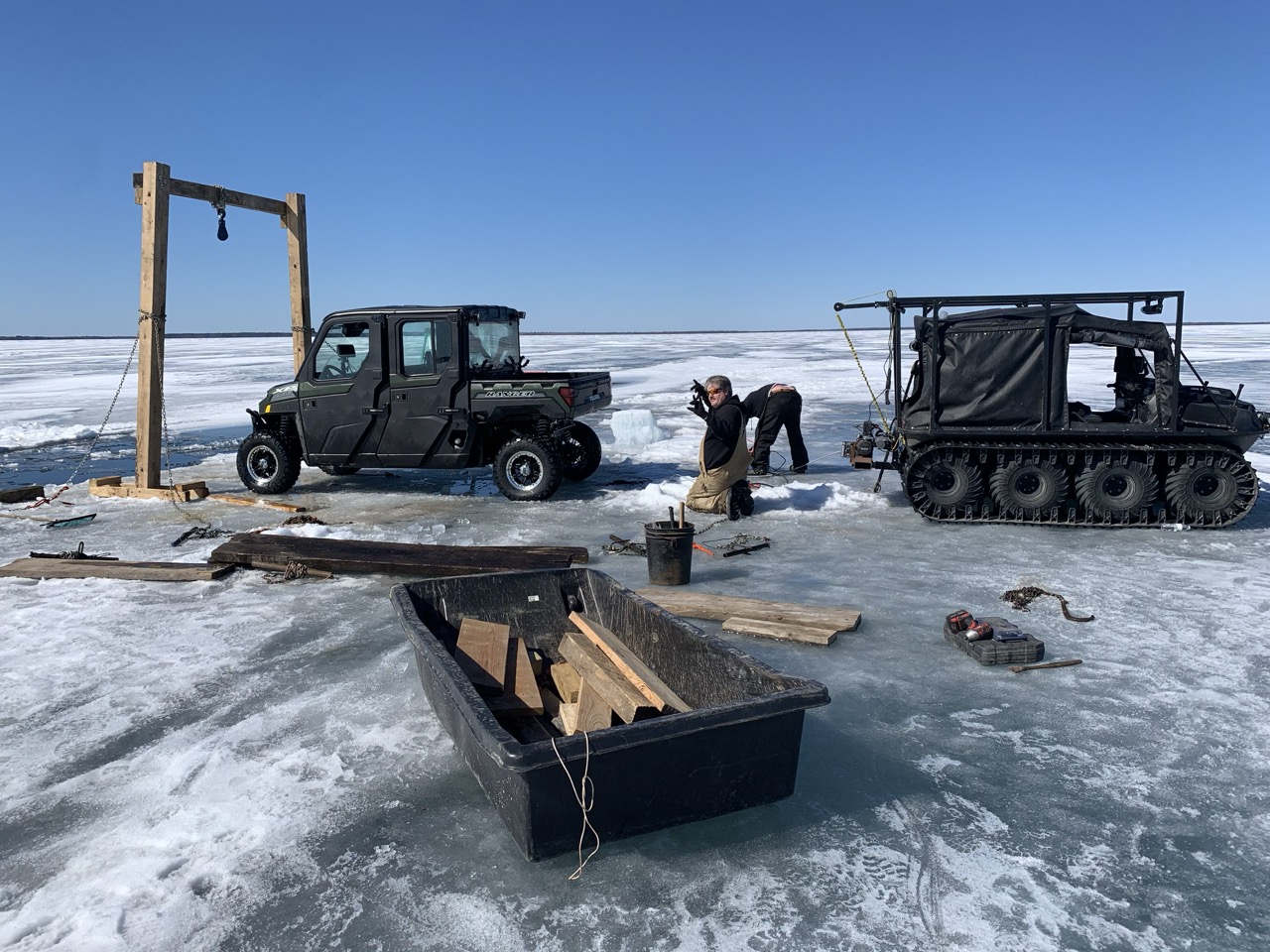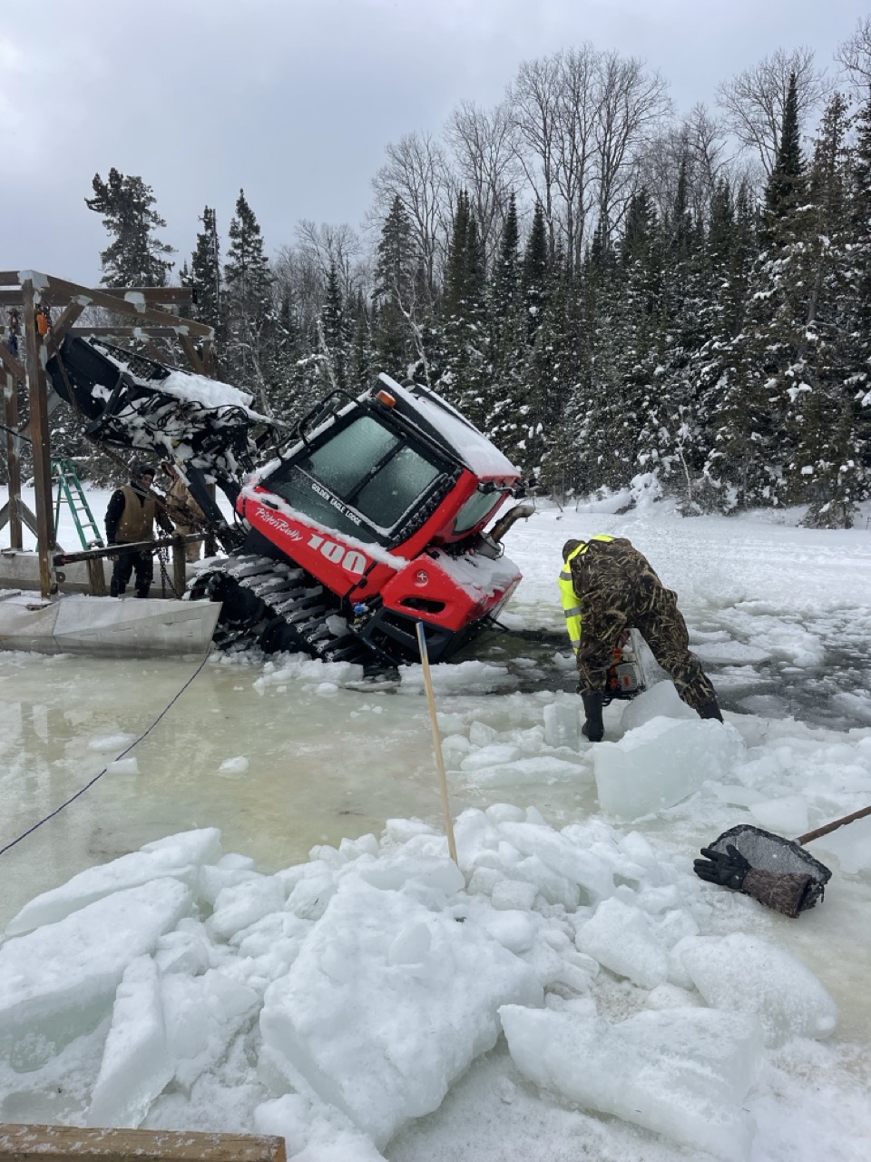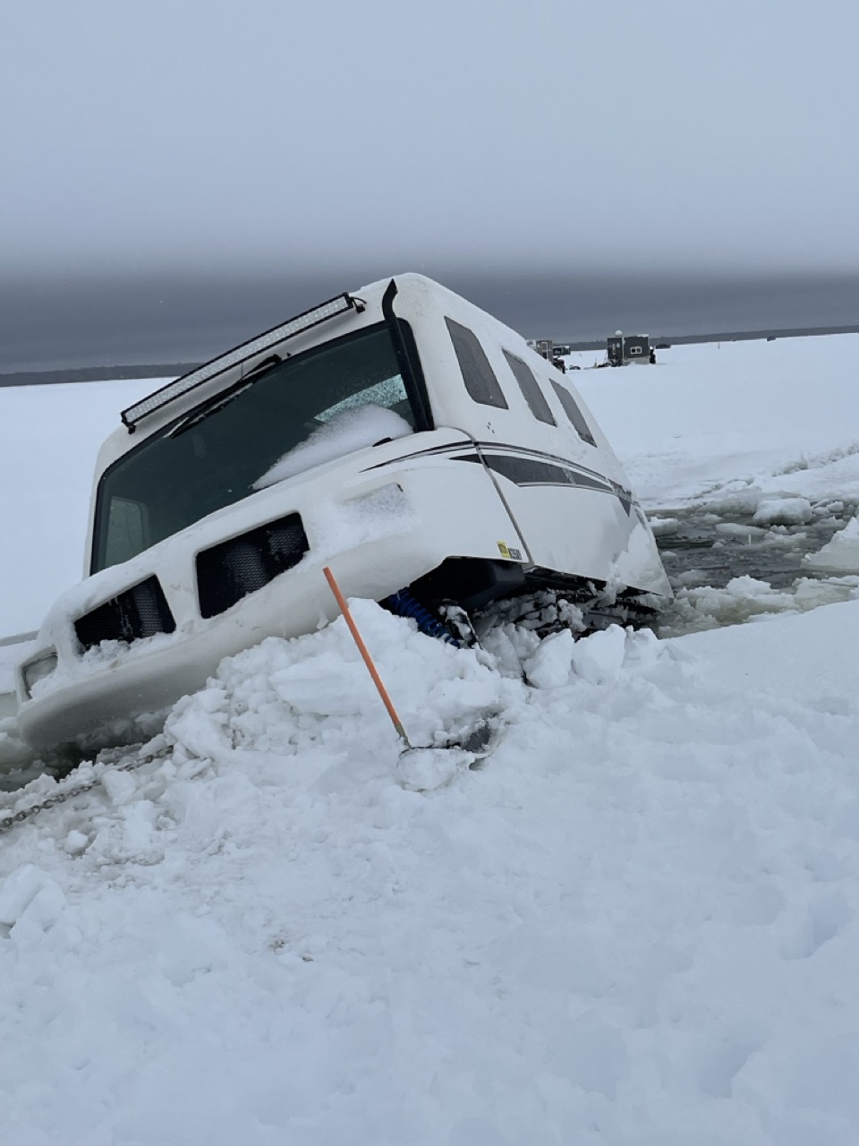 John Deere gator side by side was towing a wheeled fish house off the lake ahead of some rain and broke through. We detached and recovered both in deteriorating conditions.