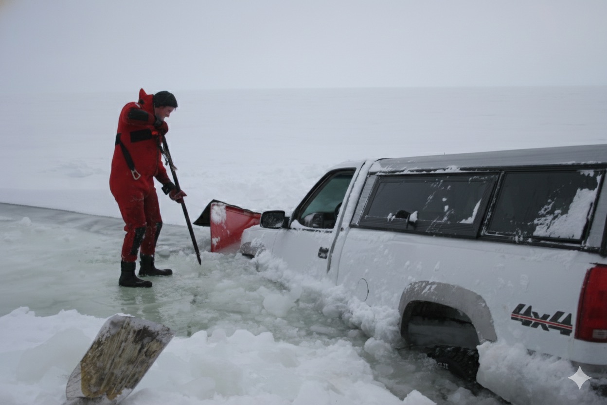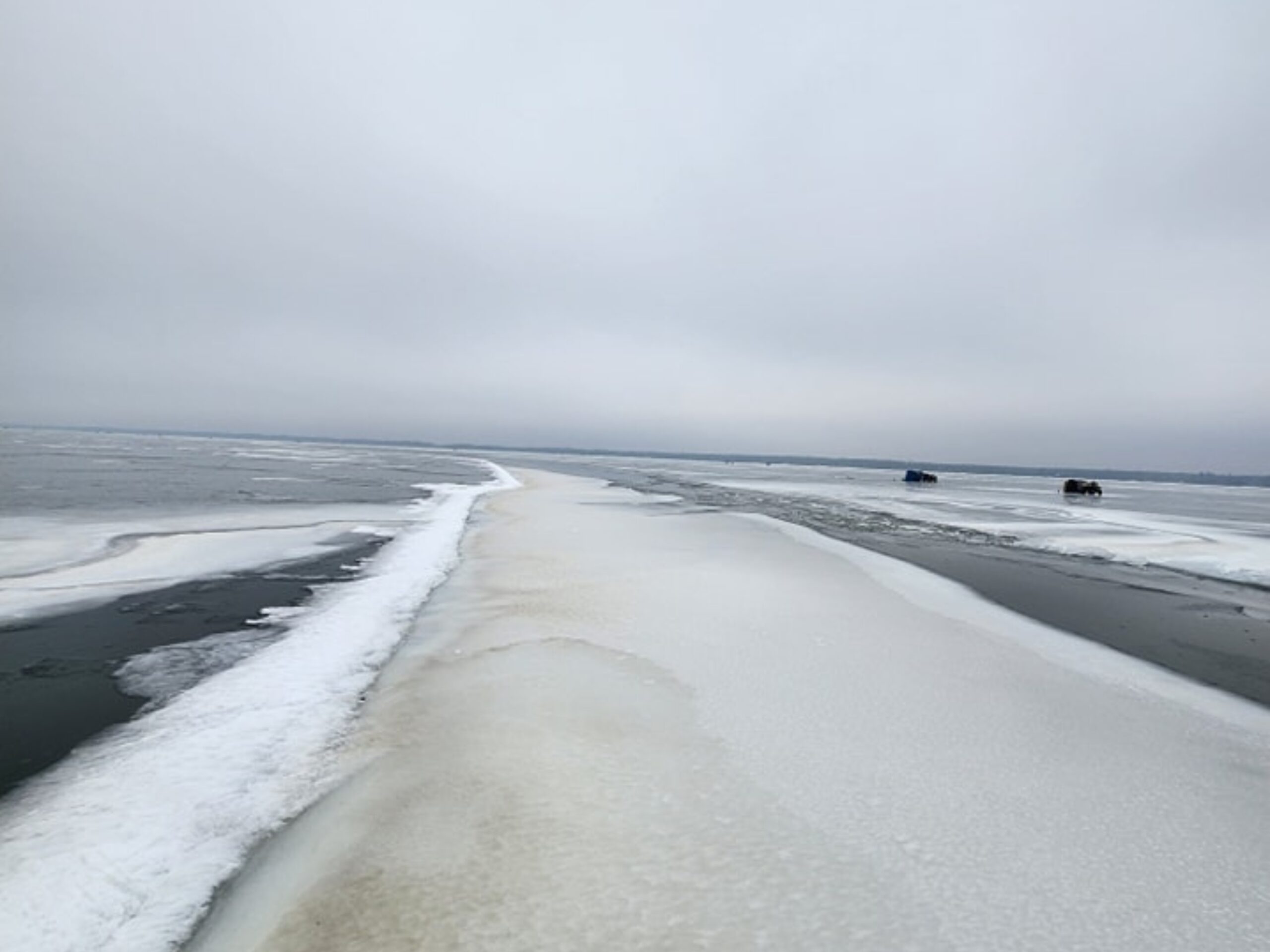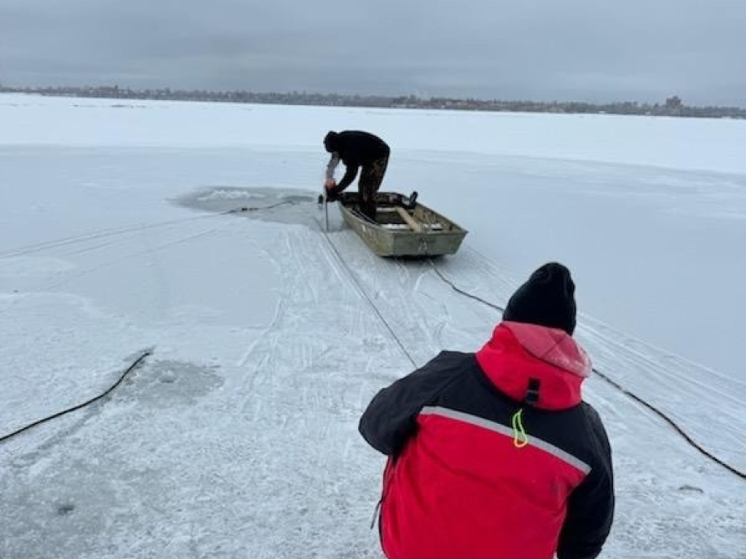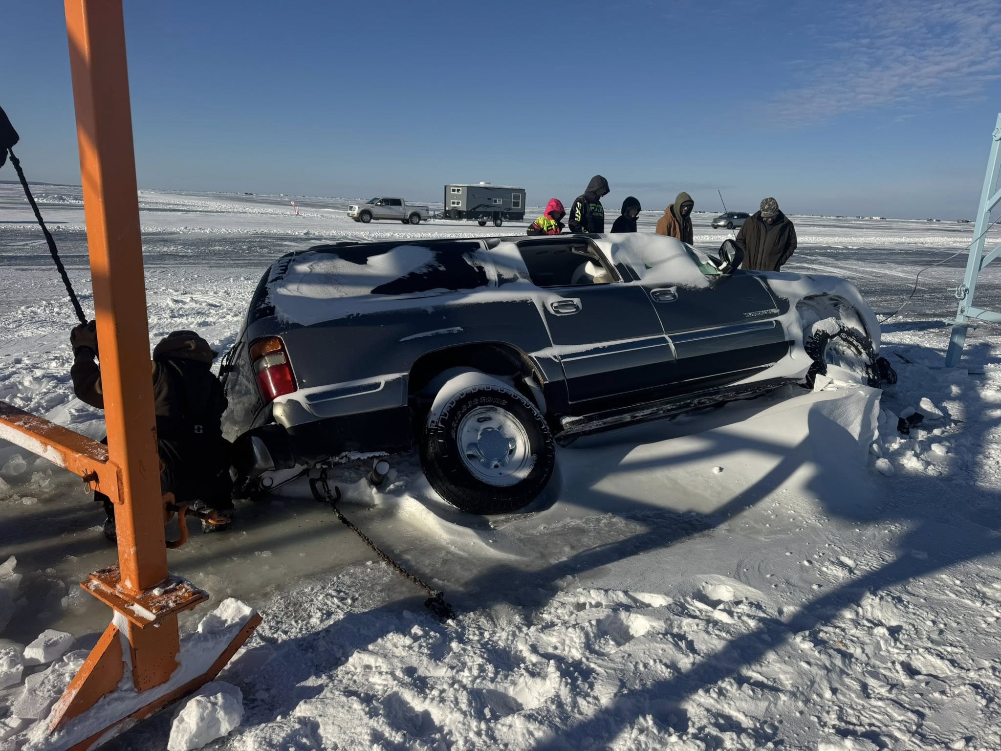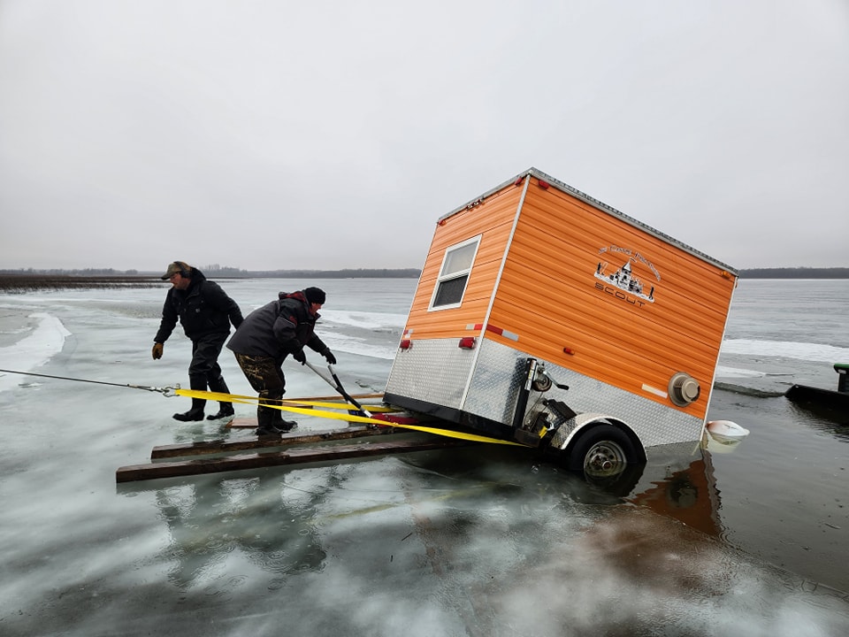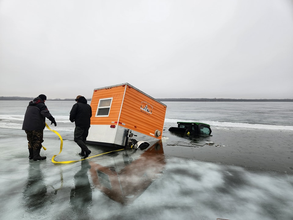 Our crew responded to an emergency call after a truck and fish house broke through a large crack on Upper Red Lake in Northern Minnesota. Everyone made it out safely!