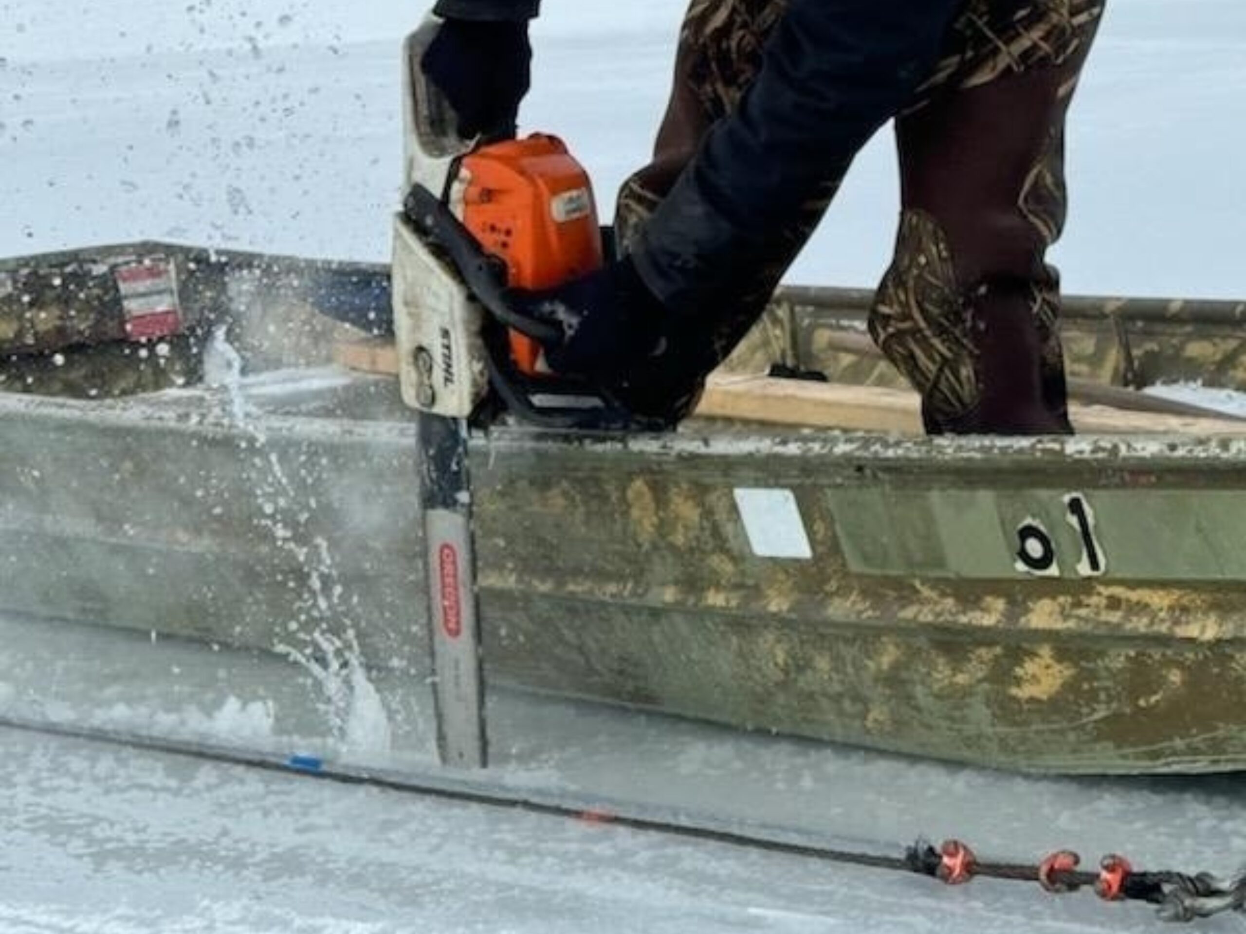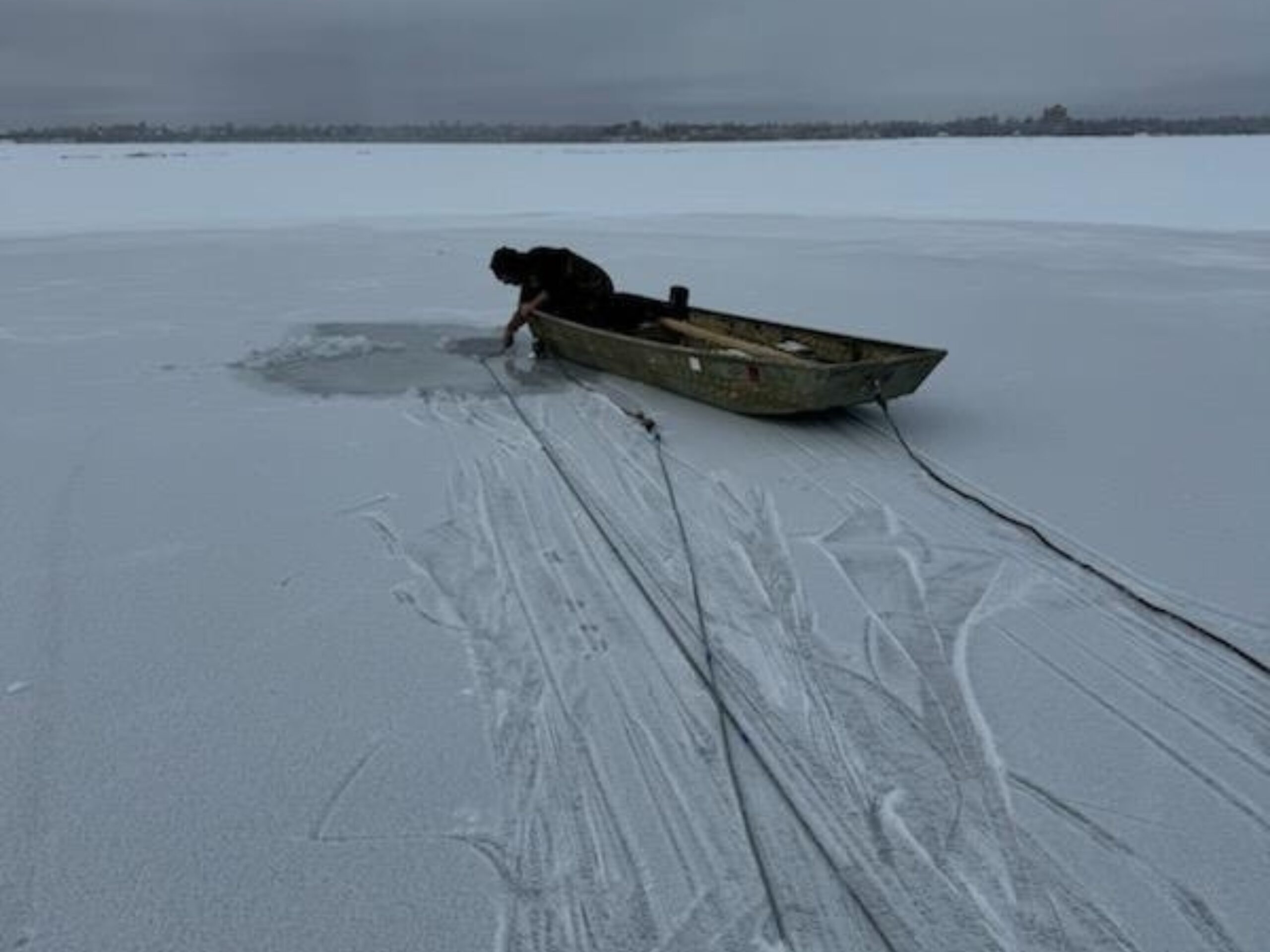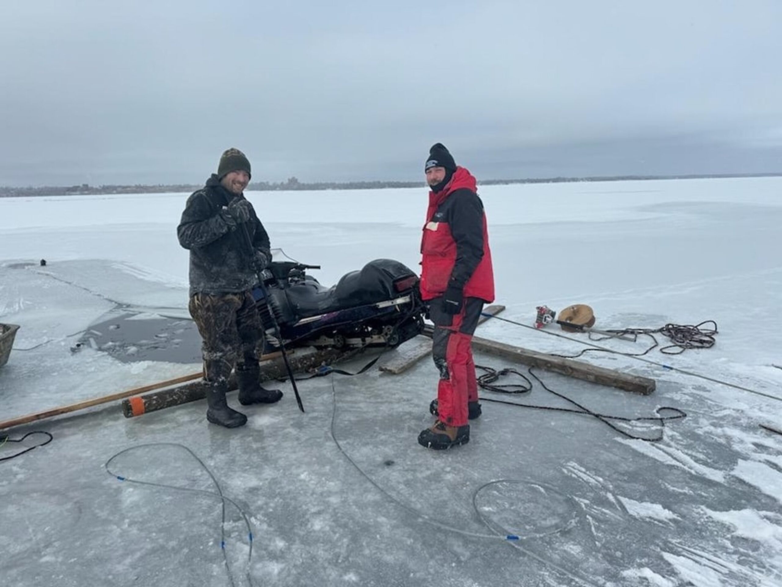 Snowmobile went through a patch of thin ice on Lake Bemidji and sank to the bottom. The ice was so thin we had to stage 100 yards away and cut the ice to pull it to a safer position.