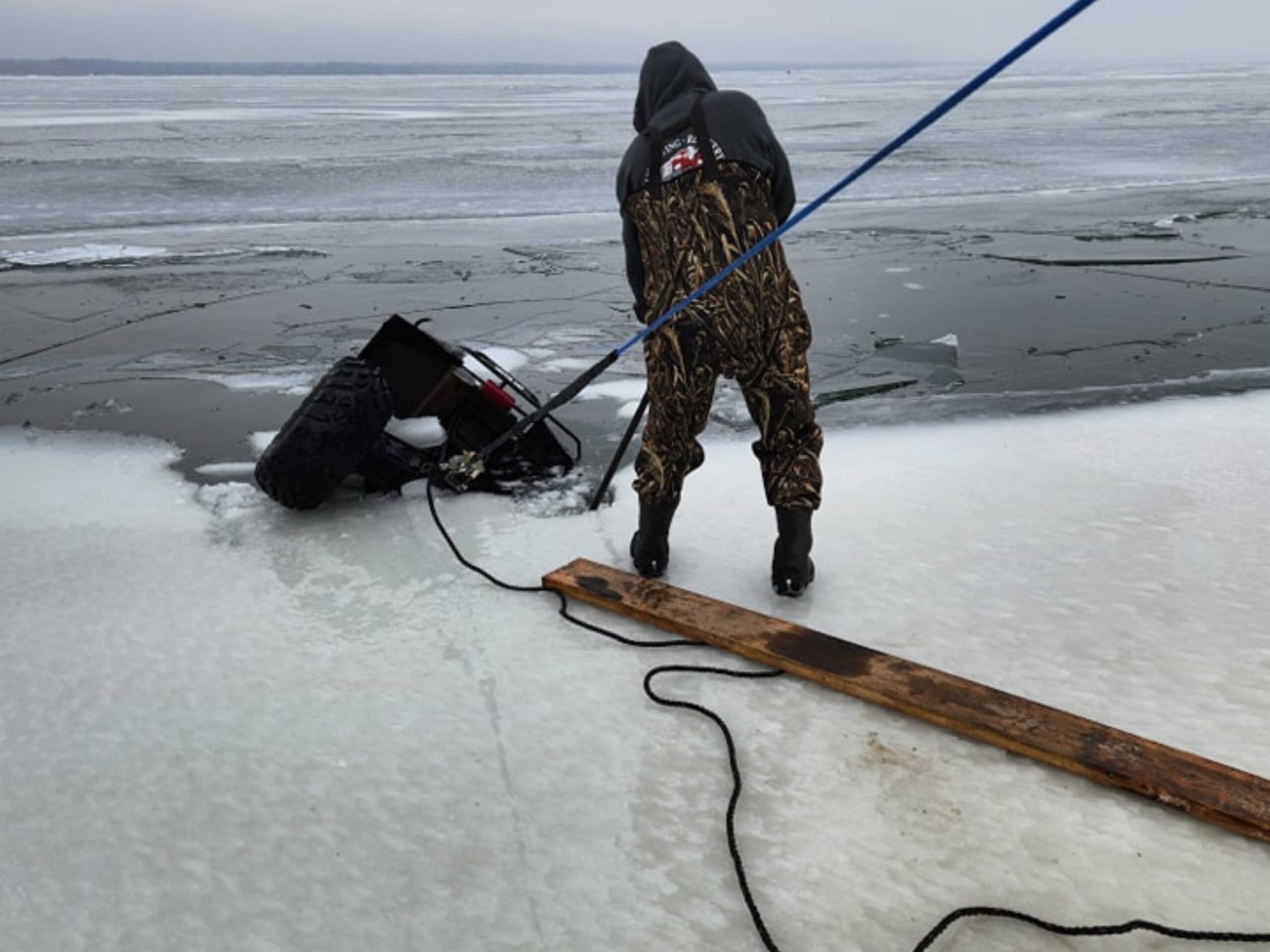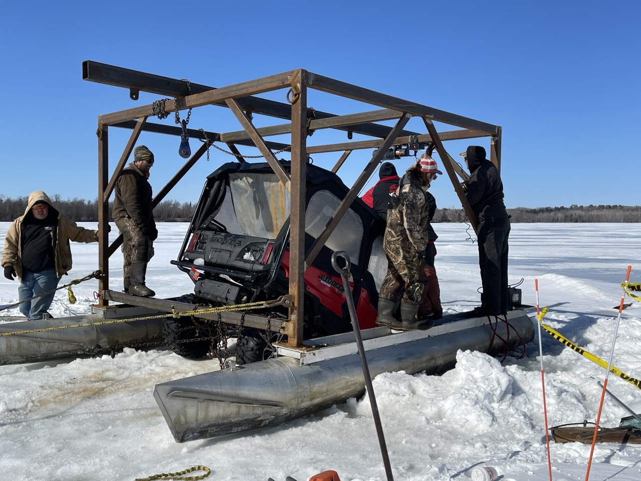 Polaris Ranger with plow broke through the ice and sunk to the bottom of Grace Lake near Bemidji, MN.