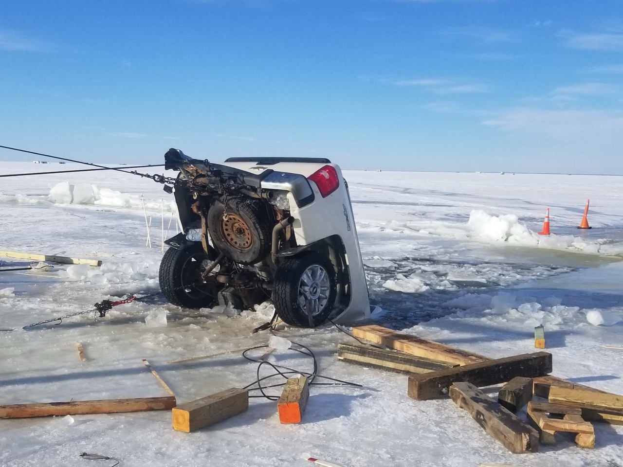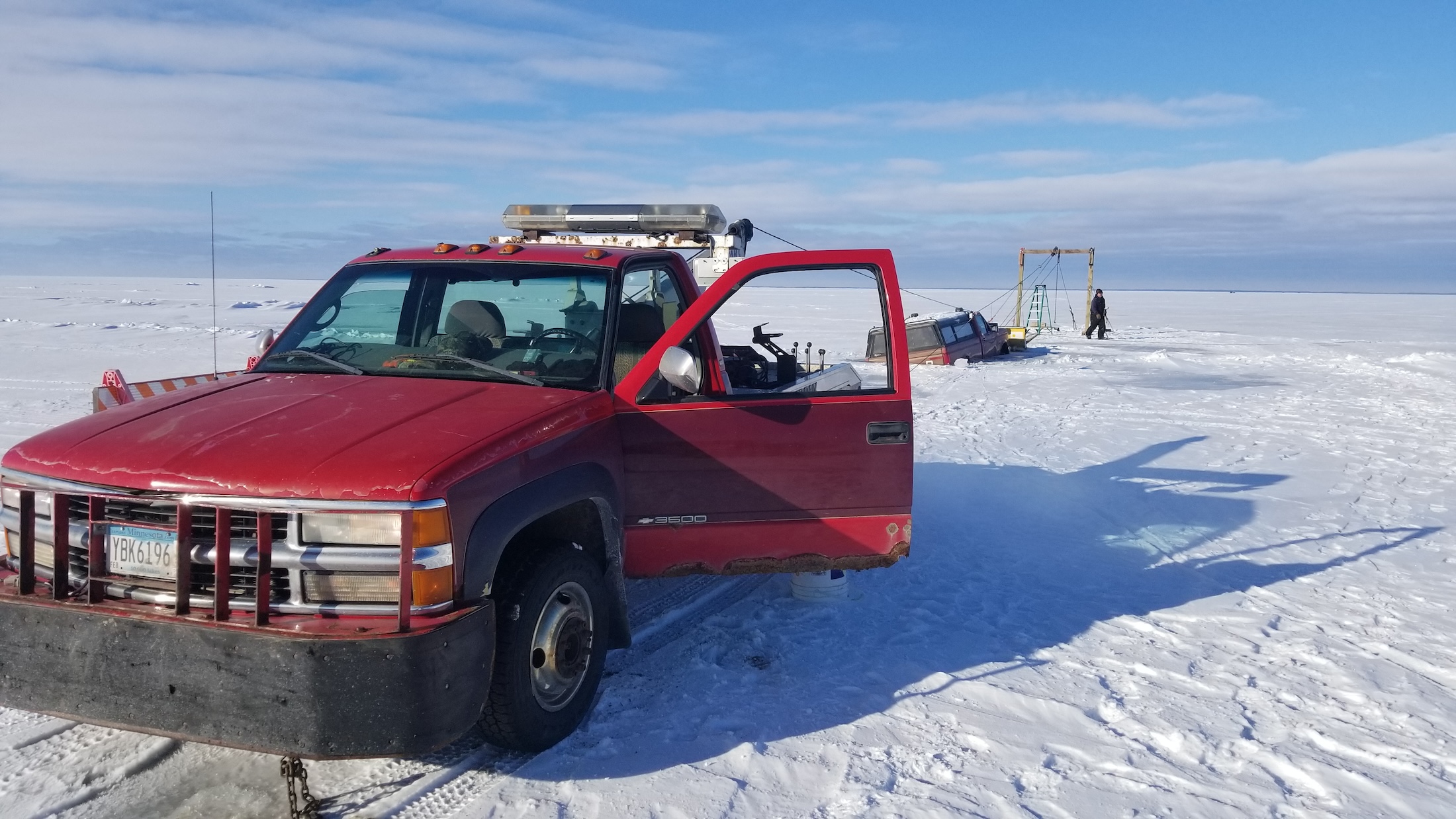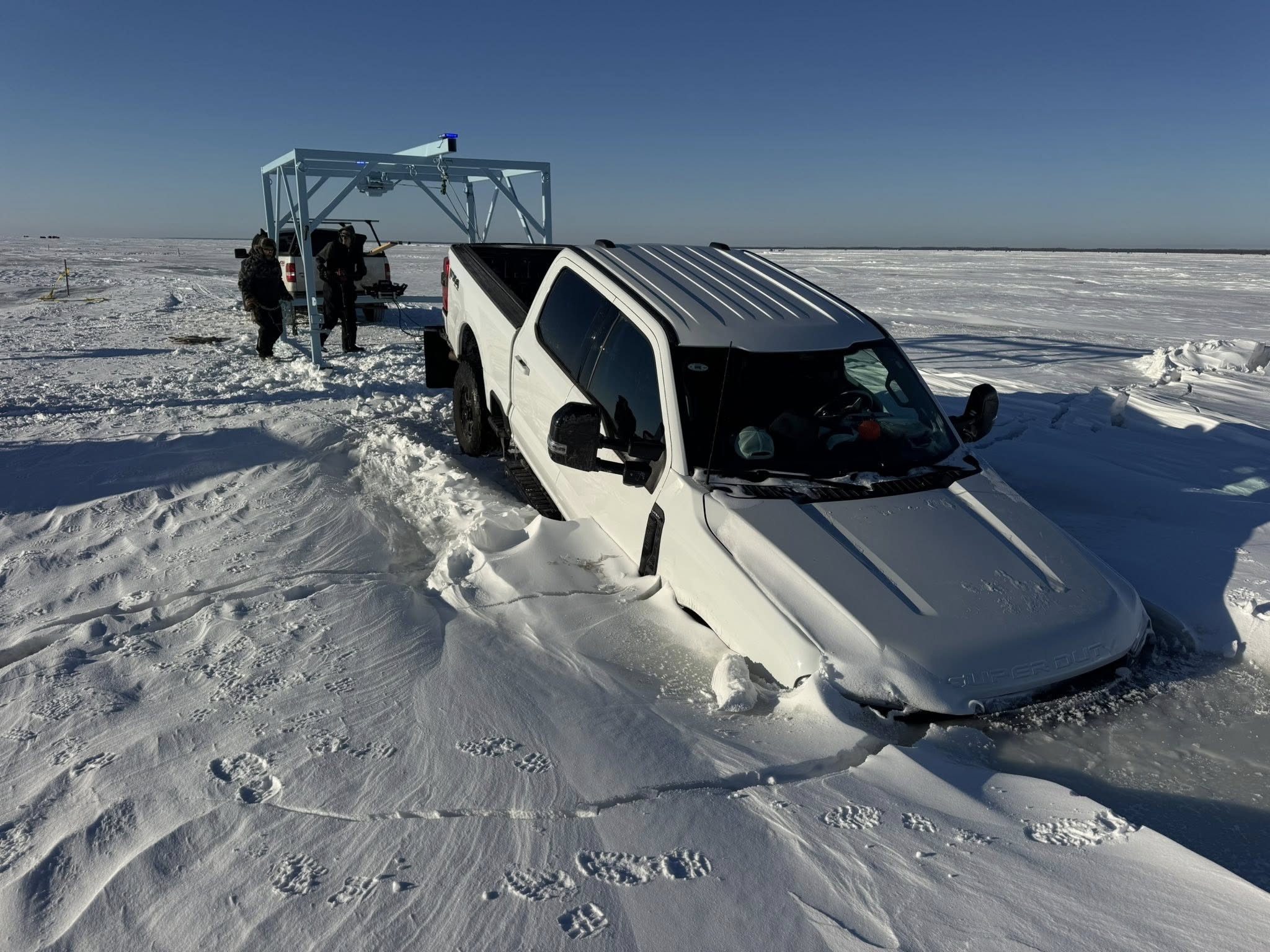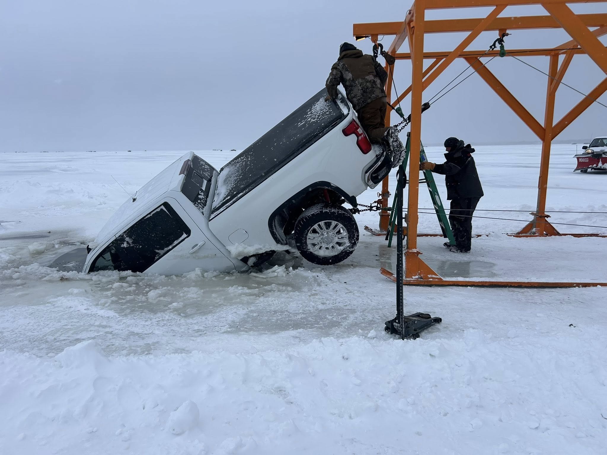 One-ton, heavy-duty pickup truck successfully extracted from Red Lake in northern Minnesota.