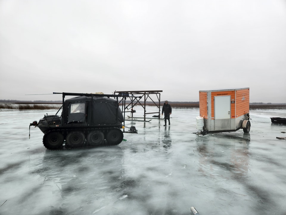 We were called out on December 26th for a large skid house that broke through Upper Red Lake’s ice, our crew arrived the next morning to find challenging conditions—the house had gone through 9.5 inches of ice, with only 10.5 inches available to work with and open water just 200 yards away.